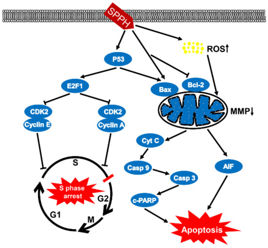 Proposed model for the mechanisms of SPPH-induced cytotoxicity in SGC-7901 cells. On the one hand, SPPH enhanced P53 expression to induce E2F1 and suppressed two complexes of CDK2 and Cyclin E, CDK2 and Cyclin A, which blocked the cell cycle in S phase. On the other hand, SPPH promoted ROS accumulation and induced the expression of Bax by enhancing the expression of P53, or induced Bax expression, inhibited Bcl-2 expression independently, destroyed MMP and induced Cyt C and AIF release to activate downstream caspase signal pathways and apoptosis. Casp 9, caspase-9; Casp 3, caspase-3; c-PARP, cleaved PARP.