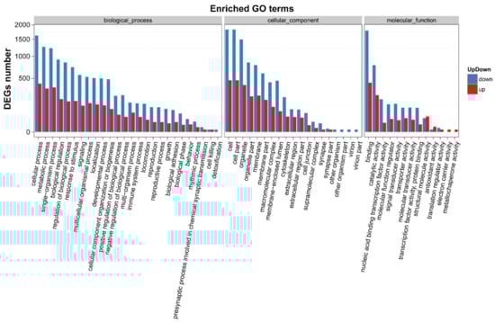 GO functional classifications of DEGs after SPPH treatment. The x-axis indicates the GO terms, and the y-axis indicates the number of DEGs. GO terms were grouped into three ontologies: biological process, cellular component and molecular function. Down- and up-regulated genes are presented in blue and red, respectively.