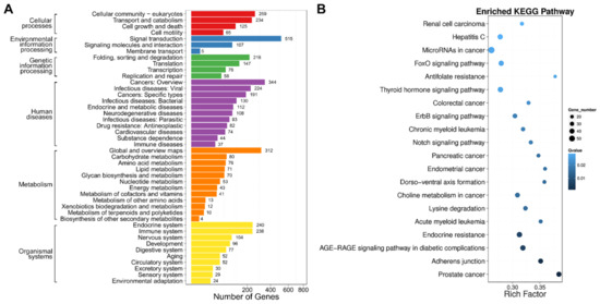 KEGG classification and enrichment of DEGs. (A) KEGG classification of DEGs. The x-axis indicates the number of DEGs, and the y-axis indicates the KEGG pathways; (B) Pathway enrichment of DEGs. Rich Factor indicates the ratio of differentially expressed gene numbers annotated for a pathway term relative to all the genes annotated with this pathway term. The Q-value is the corrected p-value ranging from 0 to 1. A higher Rich Factor and a lower Q-value represent greater intensity. Only the top 20 enriched pathway terms are displayed.