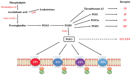 - O’callaghan, G.; Houston, A. Prostaglandin E2 and the EP receptors in malignancy: Possible therapeutic targets? Br. J. Pharmacol. 2015, 172, 5239–5250. [Google Scholar] [CrossRef] [PubMed]