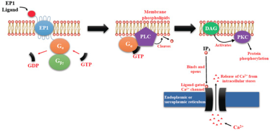 Prostaglandin E receptors (EP1)-mediated signaling events. EP1 couples with Gq, activating PLC that cleaves PIP2, to generate second messengers, IP3, and diacylglycerol (DAG). IP3 binds to and opens a ligand-gated Ca2+ channel in the endoplasmic reticulum leading to an increase in cytosolic Ca2+. Ca2+ in the cytosol exerts its effects by binding to Ca2+-binding proteins.