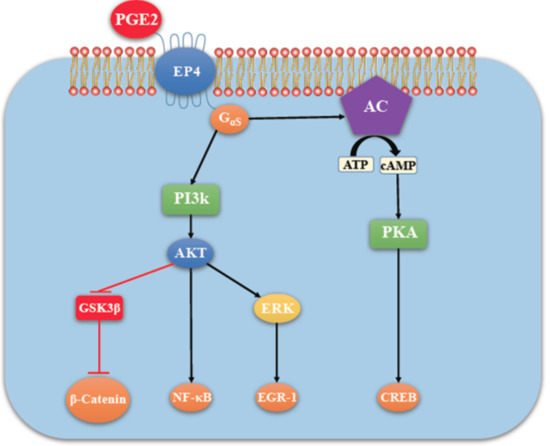 EP4 mediated signaling (in addition to PKA activation) not shared by EP2 (adapted with kind permission from O’callaghan, G.; Houston, A.; 2015; reference [13]). There is non-canonical activation of the PI3K-Akt and ERK pathways. Akt, also called protein kinase B (PKB) promotes cell survival by activating the transcription factor NF-κB. ERK is primarily a promoter of cell proliferation and migration. Cell proliferation depends on the ERK mediated activation of the transcription factor EGR-1.
