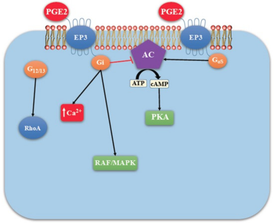 EP3 mediated signaling (adapted with kind permission from O’callaghan, G.; Houston, A.; 2015; reference [13]). EP3 has multiple isoforms, most of which are coupled with the inhibitory G-protein Gi that acts by inhibiting AC-cAMP-PKA pathway. Those coupled with Gs stimulate AC-cAMP-PKA pathway. Those coupled with G12/13 are involved in Rho family GTPase signaling utilized in cell migration by cytoskeleton remodeling.