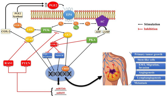 Schema of EP4 mediated signaling pathways in COX-2 expressing breast cancer. Aberrant COX- 2 activity leads to tumor progression and metastasis by utilizing multiple signaling pathways in which EP4 activation plays a pivotal role, and two COX-2/EP4 upregulated miRNAs (miR526b and miR655) are important partners. EP4 activation (like EP2) results in cAMP-dependent PKA activation leading to phosphorylation of the transcription factor CREB. PKA also upregulates WNT/β-catenin and NOTCH pathways by inhibiting GSK3. Furthermore, unlike EP2, EP4 also utilizes the non-canonical PI3K/AkT and ERK signaling pathways, respectively promoting cell survival and migration/ proliferation. COX-2 upregulates the miRNAs miR526b and miR655 via EP4 mediated PI3K/Akt activation and WNT/β-catenin/NOTCH pathways. While COX-2 induces these miRNAs, the miRNAs, in turn, upregulated COX-2. We suggest that these occur via upregulation of NF-κB, which is a well-known upregulator of COX-2 under certain conditions. Predicted targets of these miRNAs include NF-κB repressor genes. Thus there appears to exist a positive feedback loop for COX-2/EP4/NF-κB/miRNA/COX-2-mediated SLC perpetuation.
