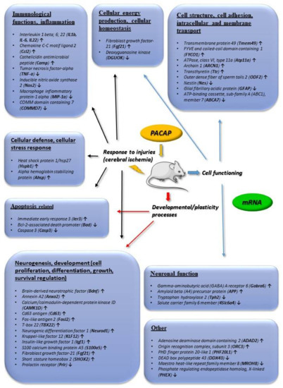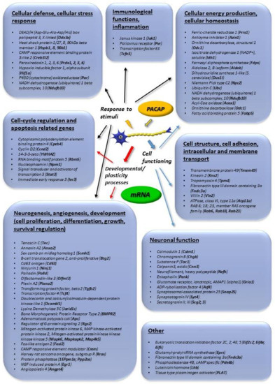 Main in vivo transcriptomic changes induced by PACAP. Arrows indicate main up or downregulated genes. The data in the figure come from the references: [32,33,36,37].