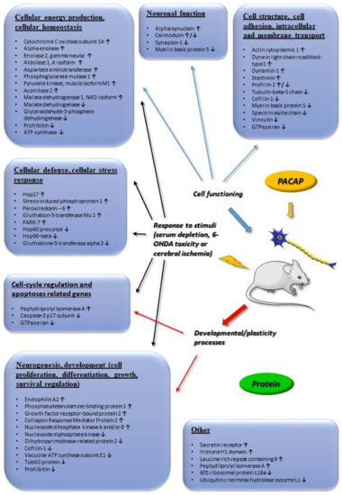 Main in vivo and in vitro proteomic changes induced by PACAP. Arrows indicate main up or downregulated genes. The data in the figure come from the references: [37,38,39,40,41,43,44,46]. Abbreviation: 6-OHDA (6-Hydroxydopamine).