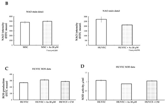 (A) A mitochondrial maximum oxygen consumption rate (OCR) test shows that with Seahorse XF-24, the OCR of hMSCs remains constant without significant changes before or after treatment with As. However, the OCR of HUVECs decreases significantly at a high concentration of As and the difference is statically significant (* p < 0.05). Cells were sequentially treated with oligomycin (line B), carbonyl cyanide p-trifluoromethoxy-phenylhydrazone (FCCP) (line C), as well as rotenone and antimycin A (line D). Maximal respiratory rate was measured after cells were treated with FCCP (blue bar zone 29). Dark orange line—HUVEC, Light orange line—HUVEC with As 20 μM. Red line—MSC, Blue line—MSC with As 20 μM. (B) A mitochondrial mass nonyl acridine orange (NAO) fluorescence assay demonstrates that under 20 µM As, the NAO green fluorescent protein (GFP) mean in HUVECs decreased compared with that in normal HUVECs. hMSCs maintain a constant mean before and after treatment with As. (C) A reactive oxygen species (ROS) assay demonstrates that ROS levels declined slightly in HUVECs treated with conditioned medium compared with those in cells treated with As for only 48 h. (D) An antioxidant superoxidase dismutase (SOD) assay shows increased SOD activity in HUVECs treated with conditioned medium compared with that in cells treated with As only. hMSCs—human mesenchymal stem cells. HUVECs—human umbilical vein endothelial cells.