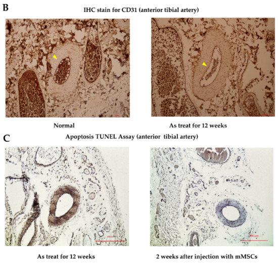 (A) HE (hematoxylin and eosin) staining for a small arteriole from the anterior lower limb of an SD rat shows a decrease in the lumen diameter of the arteriole (yellow arrow) and an increase in the number of inflammatory cells infiltrating the smooth muscles of vessel walls (green arrow) when compared with a wild-type untreated rat (left). Scale bar 200 μm. (B) IHC CD31 staining for vessels reveals a decrease in staining intensity in the As-treated group compared with that in the wild-type SD rat group (yellow arrow). Scale bar 200 μm. (C) A TUNEL assay shows numerous TUNEL-positive tissues induced by As in the control group. Compared with the control specimens, mMSCs-injected SD rat specimens show a decrease in TUNEL reactions, especially in regions containing anterior tibial vessels. Scale bar 100 μm. SD rat—Sprague Dawley rat. IHC—immunohistochemistry. CD31 stain—platelet endothelial cell adhesion molecular stain. TUNEL assay—terminal deoxynucleotidyl transferase dUTP nick end labeling assay. mMSCs—mouse mesenchymal stem cells.