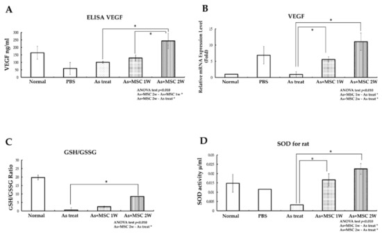 (A) An in vivo ELISA VEGF test demonstrates that VEGF levels significantly increase in blood samples drawn from SD rats with serial mMSCs (mouse MSCs) injections for two weeks (* p < 0.01). (B) An in vivo VEGF qPCR test shows increasing gene expression in rats after serial mMSCs injections for two weeks. (* p < 0.05). (C) An in vivo GSH/GSSG assay shows that the GSH/GSSG ratio increases in experimental groups subjected to serial mMSCs injections for two weeks compared with that in the As-treated group (* p < 0.05). (D) In vivo antioxidant superoxidase dismutase (SOD) assay shows increased SOD activity in experimental groups subjected to serial mMSCs injections for two weeks compared with that in the As-treated group (* p < 0.05). VEGF—vascular endothelial growth factor. mMSCs—mouse mesenchymal stem cells. PBS—phosphate buffered saline. MSC 1w—mouse MSCs injected for one week. MSC 2w—mouse MSCs injected for two weeks. GSH—reduced glutathione. GSSG—oxidized glutathione.