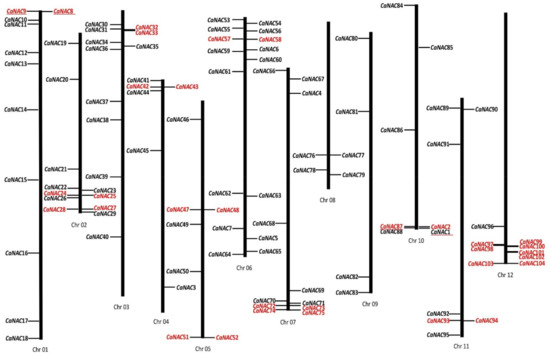 Further, we determined the tandem and segmental duplications of CaNAC genes along the 12 pepper chromosomes. As shown in Figure 1, 16 CaNAC gene clusters (genes labeled in red) containing 32 tandemly duplicated genes were identified on 10 chromosomes, except for chromosomes 8 and 9. Interestingly, we identified eight tandemly duplicated genes within four gene clusters on chromosome 12. The sequences of the clustered members are highly alike, suggesting the use of gene duplication in the expansion of the CaNAC family. However, the number of segmental duplicated genes was lower compared to the number of tandem duplicated genes, containing only two pairs and four genes (CaNAC1 to CaNAC87 and CaNAC8 to CaNAC9) (Figure 1).