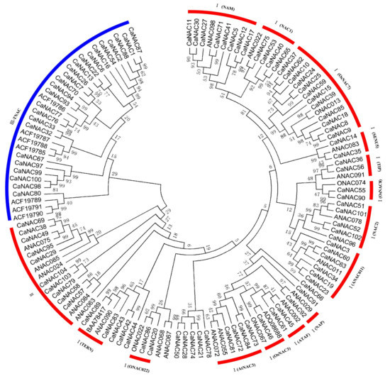 Typically, the NAC proteins have an N-terminal NAC domain and a C-terminal activation domain. The NAC domain can be further divided into five subdomains, A to E [3]. All of the putative 104 NAC genes were analyzed to confirm the presence of the NAC domain, and 97 CaNAC genes, containing a complete N-terminal NAC domain, were identified; another seven genes did not have complete domains. Thereinto, CaNAC48 has only a D subdomain, CaNAC4 and CaNAC47 have D and E subdomains, CaNAC64 and CaNAC82 have C and D subdomains, and CaNAC31 and CaNAC68 have C, D, and E subdomains. Similar phenomena were observed in the potato, where 13 StNACs lack conserved A and/or B subdomains, and four StNACs do not contain conserved C and/or D subdomains [10].