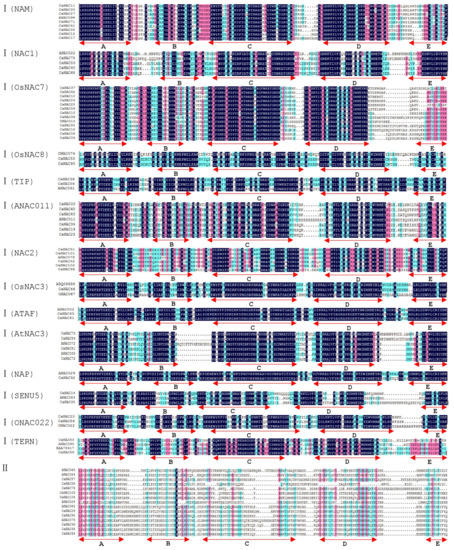 Further, we determined the characteristic features of each group and subgroup using the sequence alignments of the quantified sequences of NAC domains. As shown in Figure 3, subdomains A, C, and D were tightly conserved, whereas subdomains B and E were relatively divergent, except in subgroups 4, 5, and 6 of Group I. The sequences of subdomains B and E in subgroups 4, 5, and 6 were almost identical, akin to observations in Arabidopsis [3]. In this regard, pepper is similar to Arabidopsis and rice. Compared with Group I, the sequences of NAC in Group II from Arabidopsis or rice have low similarity to CaNAC in pepper, except for subgroup ANAC075 (Figure 3).