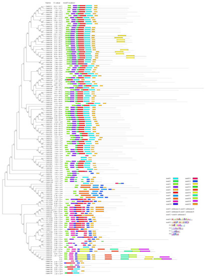 The MEME 4.12.0 online program (Available online: http://meme-suite.org/) was used for the identification of motifs in the C. annuum NAC protein sequences. The optimized parameters of MEME were employed as follows: number of repetitions, any; maximum number of motifs, 20; optimum width of each motif, between 6 and 50 residues [40].