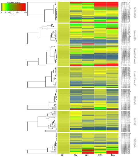 Under salt treatment, only the expression of one gene, CaNAC20, was not detectable in the leaves of the treatment groups. However, the expression of 10 genes was significantly upregulated in response to stress treatment, increasing on average by more than 10-fold after treatment (Figure 5, genes labeled in red or dark green). Of note, CaNAC72 was induced by more than 600-fold after 12 h of salt treatment. As shown in Figure 5, the expression of CaNAC50 and CaNAC86 were downregulated, while the expression of CaNAC50 significantly decreased by 0.2-fold after 24 h of treatment.