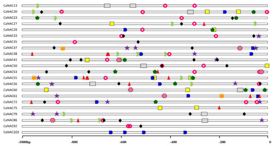 Predicted cis-elements in the promoter regions of CaNAC genes. The promoter sequences (−1000 bp) of 22 CaNAC genes were analyzed. The names of the CaNAC genes are shown on the left side of the figure. The number at the bottom indicates the number of the nucleotides to the translation initiation codon, ATG. The elements are identified as follows: green dovetail for the CGTCA element, red triangle for the ABRE element, yellow square for the W-box element, purple five-pointed star for the TCA element, black diamond for the TC-rich repeats element, dark green pentagon for the MBS element, orange oval for the WUN element, blue pentagon for the GARE element, pink circular crown for the HSEs element, the grey rectangle for the ERE element, the rose red hexagon for the LTR element.
