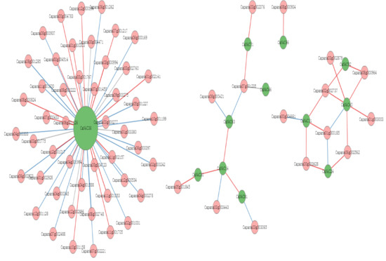 The interaction network of CaNAC genes in pepper according to the orthologs in Arabidopsis. The green circles represent the CaNAC genes, and the pink circles represent the pepper genes interacting with CaNAC genes. The red lines correspond to PCC > 0 (Pearson Correlation Coefficient), the blue lines mean PCC < 0, and the gray lines indicate that the PCC is unknown.