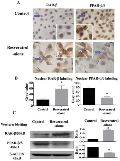 2.6. Differential Response of Retinoic Acid Receptor (RAR)-β and Peroxisome Proliferator-Activated Receptor (PPAR)-β/δ to Resveratrol