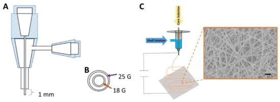 Schematic showing core/shell electrospinning spinneret. (A) Side view of spinneret, (B) Top-down of co-axial needles. Inner gauge size (orange) and outer gauge size (purple), (C) Electrospinning setup with SEM image of resulting core/shell nanofibers. Scale, 2 μm.