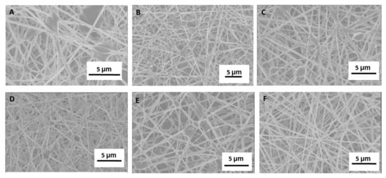 PGS/PLGA Core/Shell nanofibers were electro spun using a co-axial needle (Figure 1A,B) to produce an optimized fiber mat similar to our previously published 250 ± 50 nm PLGA nanofibers [33] while still incorporating as much PGS pre-polymer in the fiber strands as possible. Optimization of PGS/PLGA core/shell fiber mats was performed by changing the electrospinning parameters: core flow rates (μL/min), shell flow rates (μL/min), voltage (kV) and distance (cm), respectively. The voltage was changed to maintain a stable Taylor cone during fabrication, given stability issues with higher flow rates for the core solution. Characterization of fibers in which the parameters were varied was done by SEM. The 9/1.5/13/15 parameters showed an unstable Taylor cone and resulted in broken fibers with PGS-rich beads (Figure 2A). As the amount of PGS to PLGA flow rates decreased, unstable Taylor cones were still seen while spinning. Broken non-uniform fiber mats were observed under SEM (Figure 2B–E). The fiber mat with the electrospinning parameters 1.5/1.5/11/15 showed a homogenous fiber morphology and maintained a consistent stable Taylor cone during fabrication (Figure 2F).