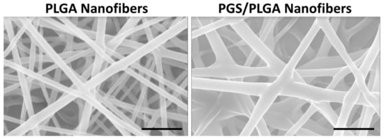Comparison of fiber diameters for poly (lactic co glycolic acid) PLGA and poly (glycerol sebacate) (PGS)/PLGA core-shell nanofibers. SEM images. PLGA and PGS/PLGA fibers mats have average diameters of 190 ± 33 nm and 245 ± 61 nm, respectively, which was measured from SEM images. Scale, 1000 nm.