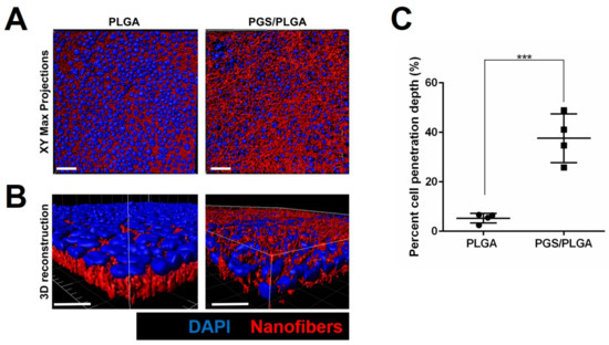 PGS/PLGA nanofibers promote cell penetration into scaffolds. (A,B) SIMS cells were cultured on PLGA or PGS/PLGA scaffolds (red) for 7 days and stained for DAPI (blue). IMARIS 3D reconstructions of Z-stacks suggest cell penetration into PGS/PLGA nanofiber mats. Scale bars, 50 μm and 10 μm for (A,B), respectively. (C) Quantification of cell nuclei penetration into PLGA and PGS/PLGA nanofiber scaffolds. Data are means ± SD (n = 4). *** p < 0.001 unpaired students t-test.