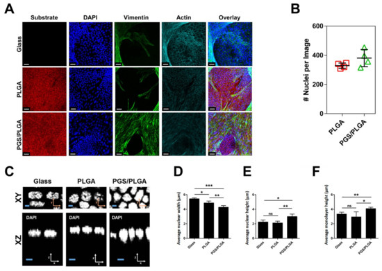 PGS/PLGA core/shell scaffolds promote enhanced epithelial self-organization. SIMS epithelial cells were grown in co-cultures with mesenchymal NIH 3T3 cells. (A) Maximum projection confocal images. Nanofibers (Red), nucleus (blue), actin cytoskeleton (cyan), and mesenchymal marker, vimentin (green). Scale, 30 μm, (B) Quantification of cell counts for SIMS cells on PLGA and PGS/PLGA scaffolds from confocal images, (C) Single XY and XZ zoomed in images of SIMS cell nuclei stained with DAPI when co-cultured with 3T3 cells on the three substrates for 7 days. Scale bar, 2 μm. Quantification of: (D) average nuclear widths, (E) average nuclear heights, (F) average monolayer heights with Bio-LIME cell. Data are means ± SD (n = 4). NS: not significant, * p < 0.05, ** p < 0.01, *** p < 0.001.