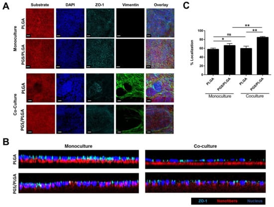Given the enhanced self-organization of epithelial cells on PGS/PLGA scaffolds vs. PLGA scaffolds, we questioned if the apicobasal polarity of the epithelial cells was increased in cells grown on the PGS/PLGA scaffolds. Confocal z-stack images were collected of SIMS cells grown alone or in the presence of NIH3T3 cells; staining of the scaffolds (red), DAPI (blue), ZO-1 tight junction protein (cyan), and vimentin (green) was performed (Figure 7A). Localization of the tight junction protein, ZO-1, was qualitatively observed in XZ slices and further quantified using Bio-LIME for both SIMS cell monoculture and co-culture (Figure 7B,C). The percent apical localization was quantified by taking each sample’s average SIMS cell nuclear height and establishing an offset that would be the top 25% and above. This was considered to be apical localization while all fluorescence below this value per sample was deemed basolateral protein expression. Z-stack images with comparable cell density were further analyzed for protein localization. Figure 7B shows X-Z cross sections of epithelial cells in monoculture and co-culture assays. It was suggested visually that cells cultured on the PGS/PLGA scaffold showed higher degrees of apical localization of the tight junction protein, ZO-1, than did cells grown on PLGA scaffolds (Figure 7B).