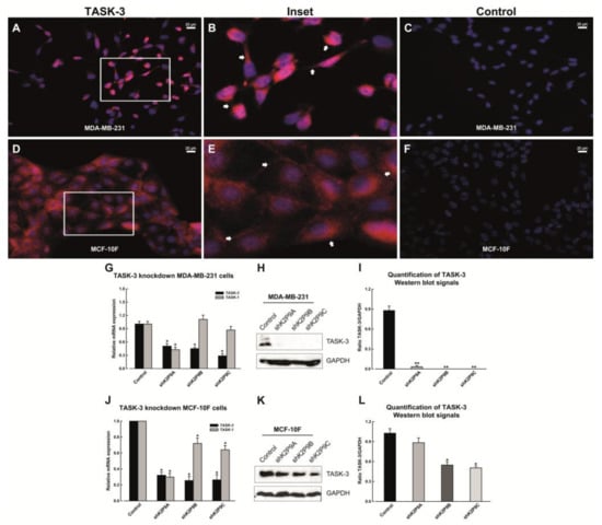 Cellular localization of TASK-3 in MDA-MB-231 and MCF-10F cells was analyzed by immunofluorescence as described previously []. Briefly, cells were seeded on coverslips, fixed in 4% paraformaldehyde (PFA)/1× phosphate-buffered saline (PBS) for 20 min at room temperature, and permeabilized with 2% bovine serum albumin in 1× PBS containing 0.1% Triton X-100 for 30 min. After incubating in blocking buffer, cells were incubated with anti-TASK-3 antibody (1:100; sc-11317, Santa Cruz Biotechnology, USA) overnight at 4 °C. Negative controls were treated in the same way, replacing the primary antibody with 1× PBS. Cells were then incubated with an Alexa Fluor 594-conjugated secondary antibody (ab150132; Abcam, Cambridge, MA, USA) at 1:1000 dilution, for 1 h at room temperature. Finally, DAPI (4′,6-diamidino-2-phenylindole, 0.1 µg/mL for 5 min) was used to stain cell nuclei. Immunofluorescence images were acquired in a fluorescence microscope (Olympus BX53; Center Valley, PA, USA), coupled to a CCD camera. Digital images were acquired using the Q-Capture Pro 7 software (QImagine, Surrey, Canada). Each staining was done in triplicate in 3 independent experiments.