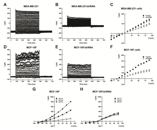 We also evaluated the electrophysiological effects of knocking down TASK-3 in MDA-MB-231 and MCF-10F cells. To this end, the whole cell patch-clamp technique was used to record the macroscopic potassium current in MDA-MB-231 and MCF-10F cells that had been previously transduced with either the vector control (pMKO.1-puro) or an shRNA targeting TASK-3 (shK2P9B). We observed that reducing the expression of TASK-3 inhibited the macroscopic potassium current (Figure 2A,B,D,E). As shown in Figure 2C,F, the shRNA-mediated depletion of TASK-3 also decreased significantly the basal activity of TASK-3 channels in MDA-MB-231 and MCF-10F cells. Also, the extracellular pH changes, in a physiological range from pH 8.0 to 5.0, were used to demonstrate the contribution of TASK-3 (a pH-sensitive K2P channel) to the macroscopic potassium current. In agreement with previous studies [,], the macroscopic potassium current was strongly inhibited in the presence of an external pH of 5.0, compared to currents studied in the same cell at pH 7.4. In presence of an external alkaline pH (8.0), the opposite effect was observed (Figure 2G,H). As shown in Figure 2H, the shRNA-mediated depletion of TASK-3 also suppresses the pH-dependent potassium current in MCF-10F cells. These data clearly show that TASK-3 is a functional channel in both cell lines, and that the pH-dependent portion of the macroscopic potassium current is carried through TASK-3 channels.