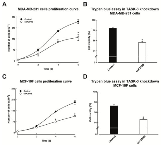 Effects of knocking down TASK-3 on cell proliferation and viability. (A,C) Proliferation curves of MDA-MB-231 and MCF-10F cells transduced with either pMKO.1 empty vector (control) or an shRNA targeting TASK-3 (shK2P9B). The values correspond to average ± SEM of four independent experiments. (*) indicates a significant difference between shRNA-treatment compared with the control (p < 0.05, n = 8 for each group, two-way ANOVA and Tukey’s multiple comparison test post); (B,D) viability was assessed using Trypan blue assay. Percentage of viability of MDA-MB-231 and MCF-10F cells after transduction with either vector control (pMKO.1 puro) or an shRNA against K2P9 (shK2P9B) is shown. Error bars represent the mean ± SEM of three independent experiments, each performed in triplicate. * p < 0.05, compared with the control, based on one-way ANOVA with Tukey’s post-test.