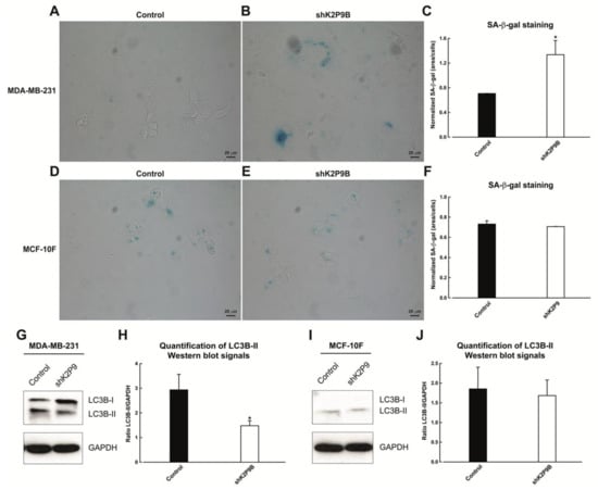 Cellular senescence and autophagy in TASK-3-depleted cell lines. (A,B,D,E) SA-β-gal activity in MDA-MB-231 and MCF-10F cells transduced with an shRNA targeting TASK-3 (shK2P9B) or vector control (pMKO.1). Representative bright-field images are shown; (C,F) quantification of the intensity of SA-β-gal staining by densitometric analyses; (G,I) immunoblot analysis of LC3B in TASK-3-depleted MDA-MB-231 and MCF-10F cells. Representative immunoblots for the detection of LC3B-I, LC3B-II and GAPDH in total cell lysates are shown. Quantitative densitometric analysis of blots are shown in (H,J), indicating the ratio between intensities of the LC3B-II and GAPDH bands in shRNA-treated and control samples. Data correspond to means ± SEM of three independent experiments. For (C,F,H,J) * p < 0.05, compared with the control, based on one-way ANOVA with Tukey HSD post-test.