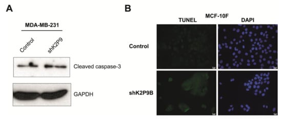 Assessment of apoptosis in cells with reduced expression of TASK-3. (A) Effect of knocking down TASK-3 on activation of caspase-3 in MDA-MB-231 cells. Representative immunoblots for the detection of cleaved caspase-3 and GAPDH in total cell lysates are shown; (B) effect of knocking down TASK-3 on apoptosis in MCF-10F cells assessed by TUNEL labeling. Representative fluorescence images of MCF-10F cell cultures transduced with the shRNA targeting TASK-3 (shK2P9B) or with a vector control (pMKO.1) are indicated. Cells were stained with DAPI (blue) and TUNEL-labeled (green).