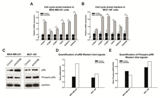 Analysis of cell cycle regulators in TASK-3-depleted MDA-MB-231 and MCF-10F cells. (A,B) The expression of the indicated cell cycle regulators was assessed by qPCR in MDA-MB-231 cells transduced with an shRNA targeting TASK-3 (shK2P9B) or vector control (pMKO.1); (C) representative immunoblots of pRB, Phospho-pRB and GAPDH, detected in total cell lysates, are shown. Quantitative densitometric analysis of blots are shown in (D,E), indicating the ratio between intensities of the pRB and Phospho-pRB bands of treated samples and the control sample, normalized on intensity of the GAPDH band. The values correspond to average ± SEM of three independent experiments. For (A,B) * p < 0.05 (n = 3 for each group, one-way ANOVA and Tukey HSD multiple comparison test post).