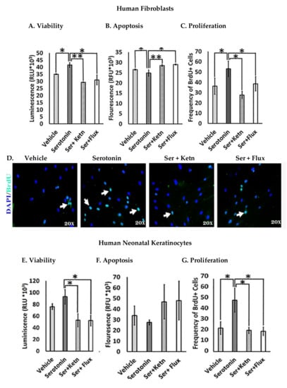 Comparative cellular effects of serotonin, ketanserin and fluoxetine drug treatments on (A,E) cell viability (B,F) apoptosis and (C,G) proliferation of human fibroblasts and neonatal keratinocytes cultures, respectively. (D,H) Immunofluorescent staining with anti-BrdU antibody (green) and 4, 6-diamidino-2 phenylindole (DAPI) nuclear stain (blue) in human fibroblasts and neonatal keratinocytes, respectively. White arrows marked BrdU + ve cells. Images scale; 20× resolution. Results were presented as mean ± Standard Deviation (SD), (* p < 0.05, ** p < 0.01), n = 5.