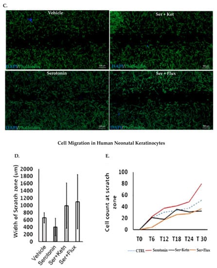 To determine the effects of serotonin and serotonergic modulating agents on cell migration, human normal skin neonatal keratinocytes (HEKn) and fibroblasts were cultured (20,000 cells each) in glass culture slides (Thermo Scientific, Lab-Tek chamber slides, Burlington, ON, Canada) for 24 h. Scratches were made by using 1000 μL pipette tip (two scratches per well). Following with PBS wash old media was replaced with fresh media containing test drugs and incubated for 24 h [62]. Immunofluorescence analysis: 4% Paraformaldehyde was used to fix the cultured cells. First Phalloidin antibody (1:30) conjugated to fluorescein isothiocyanate (Invitrogen, Burlington, ON, Canada) was added into cell culture and incubated for 1 h in blocking solution. Cells washed with PBS and subjected for mounting with medium Vectashield, containing DAPI and processed for imaging. Imaging (5× magnification) was carried out by using a Laser scanning microscope (META 510 confocal microscope, Zeiss, Göttingen, Germany) and quantified by the ImageJ software program, National Institutes of Health (Bethesda, MD, USA) [64].
