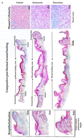 Animals (male C57BL/6 mice, body weight 25 g, 6 weeks old) were divided into three experimental groups: (1) ketanserin; (2) fluoxetine; and (3) control group. All groups were subjected to a scald burn animal protocol (AUP: 17-503) [65]. Briefly, the mice were anesthetized with isoflurane (2–3%) and body weights were recorded. Dorsal surface of the mouse was shaved. Buprenorphine was administered by intraperitoneal injection. Ringer’s lactate solution (1 mL, intraperitoneal injection) was administered to resuscitate the mice. After anesthesia the mouse was positioned in a mold (exposing 20% TBSA; total body surface area, along with whole dorsal spine surface). The mold containing mice was immersed in hot water (98 °C water, 10 s) to produce scald burn, and then put it back into experimental cages. Mice were monitored until they were fully awake and shifted back into the animal room. Sham treatment only received anesthesia and Ringer’s lactate solution induced resuscitation. Ketanserin, fluoxetine and vehicle groups received daily systemic treatment via intraperitoneal administration (10 mg/Kg of body weight) for the respective drugs, up to two weeks post-burn. Mice were sacrificed on day 14 and biopsies were taken from wound sites and normal skin area, for comparison. Skin wound samples were processed for respective skin wound histology [66].