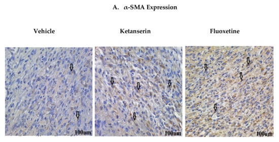 Normally, in acute wounds, myofibroblasts are only expressed transiently [27]. The proliferation phase is marked by extensive myofibroblast expression that are involved in collagen deposition, as well as wound closure. Alpha smooth muscle actin (α-SMA) is expressed by myofibroblasts during wound healing and is considered to be a wound maturation marker [28]. In order to find out the effects of serotonergic drugs on myofibroblasts expression, dermal fibroblasts were immunostained for α-SMA marker (Figure 4A). Experimental results showed that fluoxetine and ketanserin treatments significantly enhanced the α-SMA expression (44.36 ± 8.5, p < 0.005 and 38.98 ± 9.1, p < 0.023, respectively) as compared to the control group, which showed a lower α-SMA count (23.68 ± 8.2) (Figure 4D). The elevated myofibroblast expression in wound dermal area after two weeks post-burn injury suggests SSRI-mediated peripheral serotonin impairment. Interestingly, lower α-SMA expression in control group correlates with a smaller wound size. Additionally, in ketanserin treated group 5HTR2a antagonism suggests that there might be a dysregulated proliferation and remodeling in burn wounds resulting in poor wound healing.