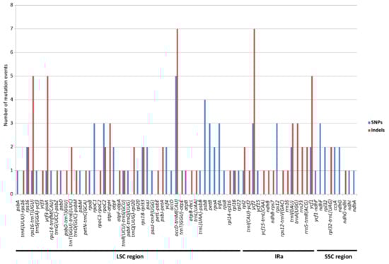 - Magee, A.M.; Aspinall, S.; Rice, D.W.; Cusack, B.P.; Sémon, M.; Perry, A.S.; Stefanović, S.; Milbourne, D.; Barth, S.; Palmer, J.D. Localized hypermutation and associated gene losses in legume chloroplast genomes. Genome Res. 2010, 20, 1700–1710. [Google Scholar] [CrossRef] [PubMed]