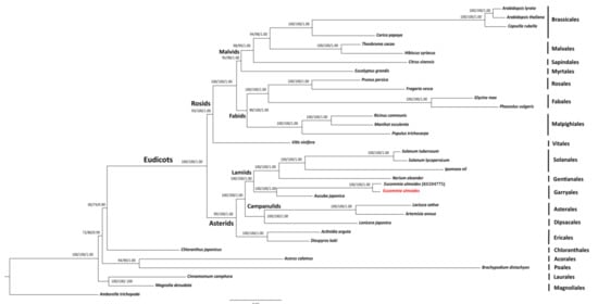- Jansen, R.K.; Cai, Z.; Raubeson, L.A.; Daniell, H.; Depamphilis, C.W.; Leebensmack, J.; Müller, K.F.; Guisingerbellian, M.; Haberle, R.C.; Hansen, A.K. Analysis of 81 genes from 64 plastid genomes resolves relationships in angiosperms and identifies genome-scale evolutionary patterns. Proc. Natl. Acad. Sci. USA 2007, 104, 19369–19374. [Google Scholar] [CrossRef] [PubMed]
