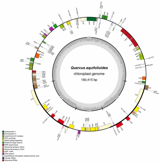 - Yang, Y.; Zhou, T.; Duan, D.; Yang, J.; Feng, L.; Zhao, G. Comparative analysis of the complete chloroplast genomes of five Quercus species. Front. Plant Sci. 2016, 7, 959. [Google Scholar] [CrossRef] [PubMed]