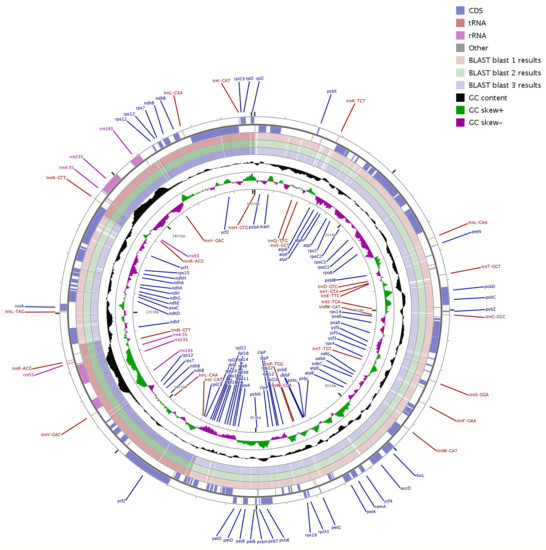 - Grant, J.R.; Stothard, P. The CGView Server: A comparative genomics tool for circular genomes. Nucleic Acids Res. 2008, 36, W181–W184. [Google Scholar] [CrossRef] [PubMed]