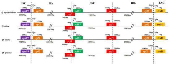 2.3. Comparison of the cp Genomes of Q. aquifolioides and Three Related Quercus Species