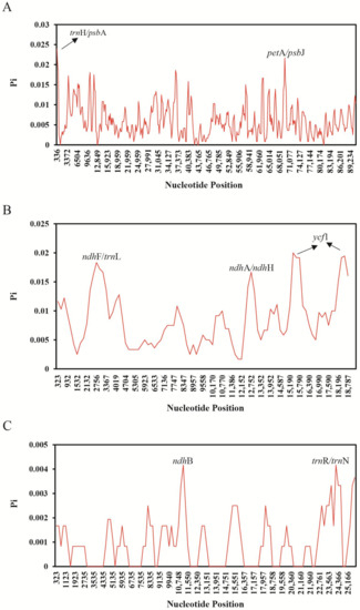 - Dong, W.; Liu, J.; Yu, J.; Wang, L.; Zhou, S. Highly variable chloroplast markers for evaluating plant phylogeny at low taxonomic levels and for DNA barcoding. PLoS ONE 2012, 7, e35071. [Google Scholar] [CrossRef] [PubMed]