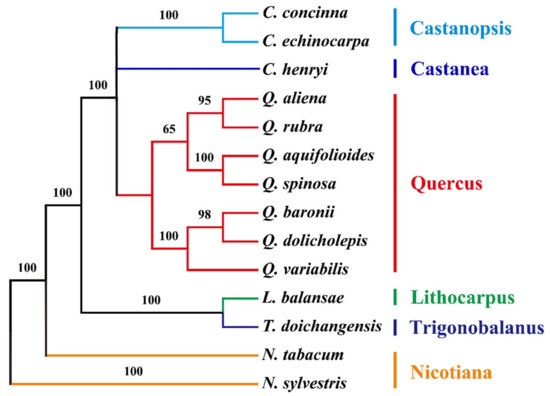 - Manos, P.S.; Doyle, J.J.; Nixon, K.C. Phylogeny, biogeography, and processes of molecular differentiation in Quercus subgenus Quercus (Fagaceae). Mol. Phylogenet. Evol. 1999, 12, 333–349. [Google Scholar] [CrossRef] [PubMed]