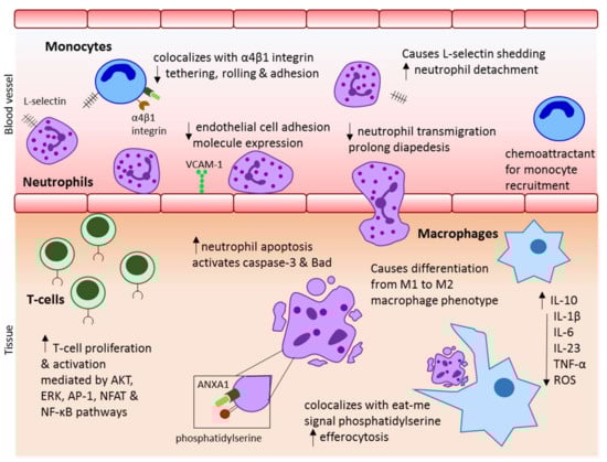 Without a doubt, further research is necessary to understand the effect of ANXA1 on CD4+ vs CD8+ cells, differentiation of T-regulatory cells, Th17 cells and B-cell development. An overview of the anti-inflammatory mechanism of ANXA1 on the immune system is provided in Figure 1.