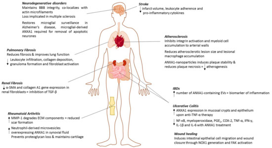 Summary of the involvement and therapeutic potential of ANXA1 in various disease states within the body.