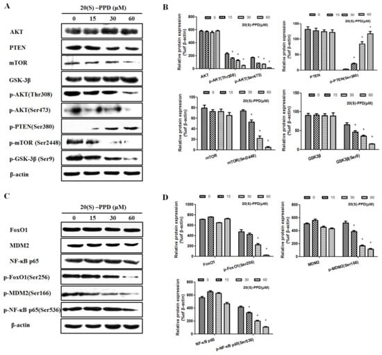 Effects of 20(S)-PPD on the PI3K/AKT/mTOR pathway and the downstream protein expression in MCF-7 cells. (A,B) Western blot analysis of the PI3K/AKT/mTOR signaling pathway-related proteins in MCF-7 cells after 20(S)-PPD (0, 15, 30, and 60 μM) administration for 24 h. (C,D) Expression of the downstream proteins Forkhead box protein O1 (FoxO1), (p-)FoxO1 (Ser256), Murine Double Mimute 2 (MDM2), p-MDM2 (Ser166), Nuclear Factor-κ-gene Binding (NF-κB) p65, and p-NF-κB p65 (Ser536) in MCF-7 cells after 20(S)-PPD treatment was detected by Western blot. All data were represented as mean ± S.D. * p < 0.05 compared to 0 μM.
