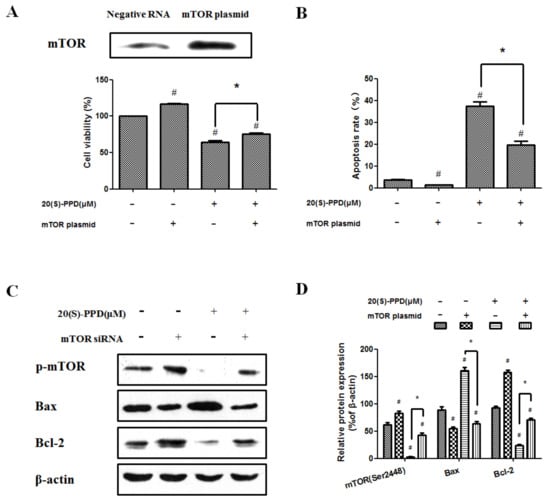 20(S)-PPD-induced apoptosis was reversed by transfection with mTOR plasmid. (A) Expression of mTOR after transfection of mTOR plasmid was viewed by Western blot (upper line). After 20(S)-PPD (30 μM) treatment in MCF-7 cells for 24 h, the MTT assay was used to determine the cell viability (lower line). (B) Flow cytometry was used to measure the apoptosis rate after 20(S)-PPD (30 μM) treatment for 24 h. (C,D) After 20(S)-PPD (30 μM) treatment of MCF-7 cells for 24 h, Western blot was used to determine the expression of Bax, Bcl-2 and p-mTOR. All data presented were represented as mean ± S.D. # p < 0.05 compared to control group, * p < 0.05 compared to 20(S)-PPD (30 μM) group.