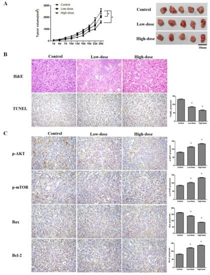 Effects of 20(S)-PPD on the nude mice xenograft of MCF-7 cells in vivo. (A) Tumor growth curves of the control and 20(S)-PPD (50,100 mg/kg) treatment groups were drawn by measuring and calculating tumor volume once every three days. (B) Excised human breast tumor images from the experimental group. (C) H&E staining, TUNEL assay, and immunohistochemistry were used to detect DNA damage, apoptosis, and p-AKT, p-mTOR, Bax, and Bcl-2 expression in tumor xenograft tissues (100×), respectively, and these data were represented by grayscale: the darker the grayscale is, the lower the protein expression. All data presented were represented as mean ± S.D. * p < 0.05 compared to the control group.