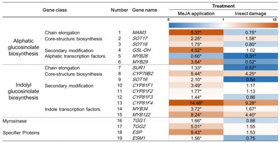 Expression of known genes involved in the GS biosynthesis pathway, myrosinase biosynthesis, and related to specifier proteins associated with GS hydrolysis in extracts of “Red Russian” kale plants 4 days after treatment with 250 μM MeJA or insect damage. Asterisk indicates a significant difference compared to the control using student t-test (p < 0.05). The values highlighted in red and in blue indicate significantly upregulated or downregulated, respectively.